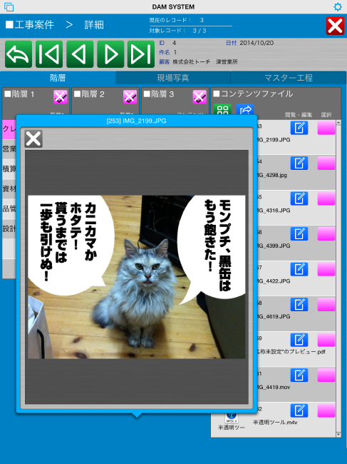 また、平面図以外でも議事録のドキュメント、エクセルの計算書、現場写真、動画などを案件単位で管理し、必要な平面図などは担当者が自身のiPadにダウンロードし、ローカル環境で利用することも可能です。