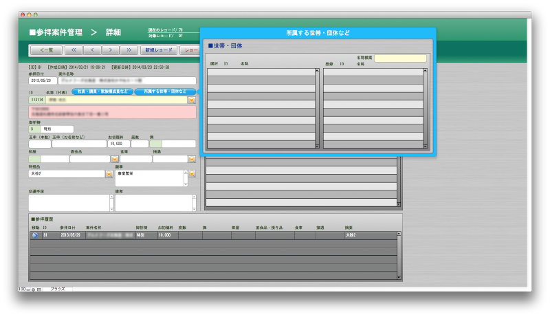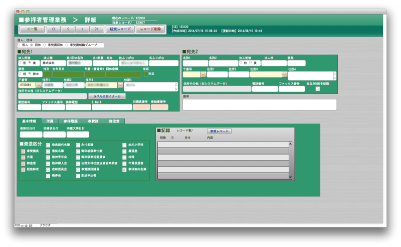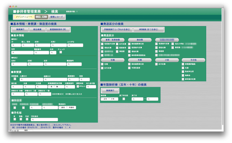参拝に来られるお客様の情報を管理したり、一定の期間ごとの行事案内や、グループ毎の案内状の送付。